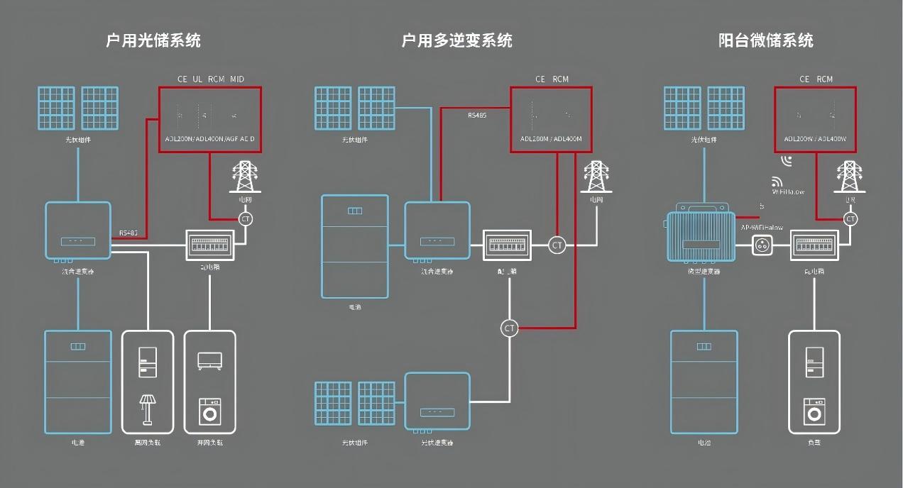다중 인버터 가정용 시스템: 기본 PV/스토리지 시스템에서 추가 PV/스토리지 시스템을 개조하여 다중 인버터 구성을 만듭니다. ADL 미터는 역류 방지 모니터링 기능을 달성하기 위해 원래 PV 생성 및 그리드 연결 지점 전류를 모니터링하여 메인 하이브리드 인버터와 상호 작용합니다.
