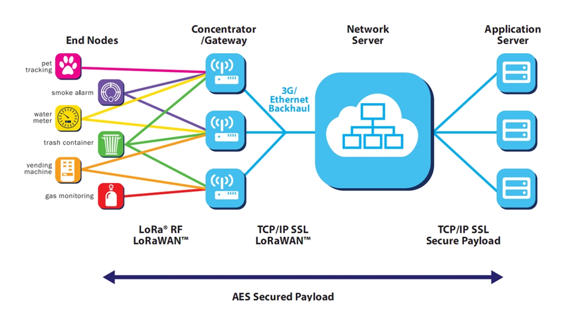 LoRaWAN은 스타 토폴로지를 채택합니다. 단말 장치는 게이트웨이를 통해 네트워크 서버로 데이터를 보낸 후 이를 애플리케이션 플랫폼으로 전달합니다.